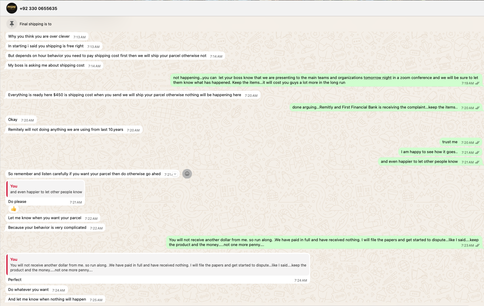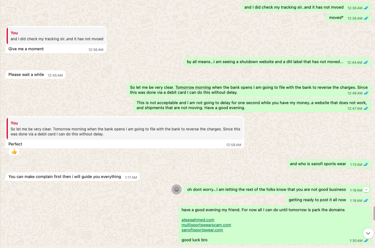 My experience involved communication with Mr. Ahmed via WhatsApp regarding an order for sportswear labels. He requested payment via Remitly. Throughout the process, I was shown examples of fabrics and other materials, but never saw the completed order in bulk. After the initial payment, Mr. Ahmed requested additional funds, citing errors in the production process. He subsequently provided shipping labels allegedly from DHL and associated with another website, SanofiSportsWear.com. Mr. Ahmed ended up ghosting me after the last payment was made, and when I tried to reach him through the site, it had been shut down!